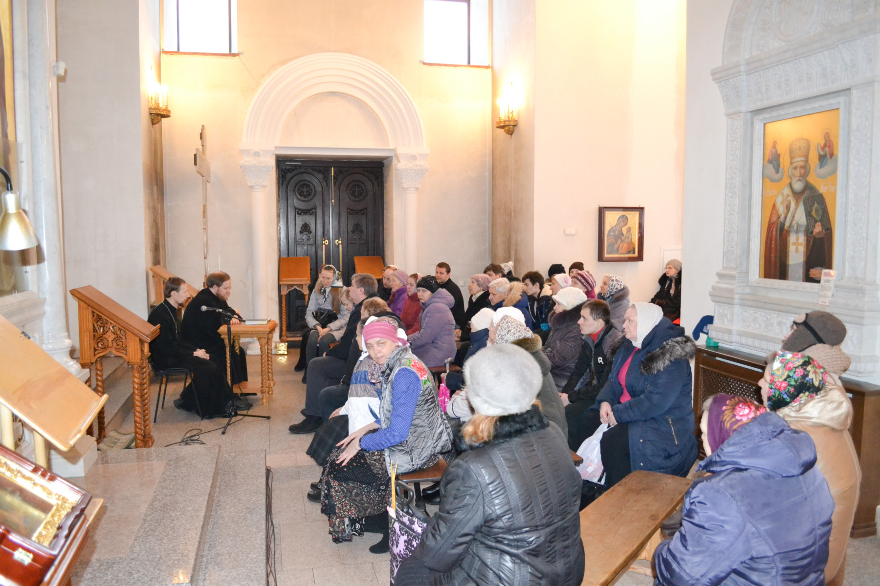 Сегодня, 21 января 2017г. в 15-00, в нашем храме состоялась встреча со священниками, на которую были приглашены все желающие, кто пришел за крещенской водой в прошедшие праздничные дни. Настоятель храма священник Александр Волков и клирик храма священник Николай Головинов говорили о жизни человека в Боге и Бога в человеке, о значимости Таинств в жизни Церкви. Многие из пришедших людей были мало знакомы с церковной жизнью, поэтому решили поговорить о воцерковлении, о том, зачем человеку нужна церковная жизнь и как к ней приобщиться.