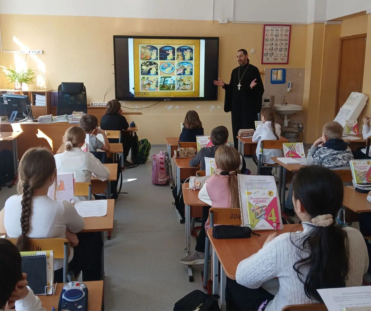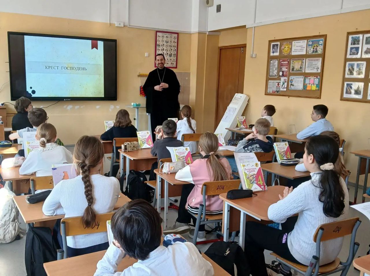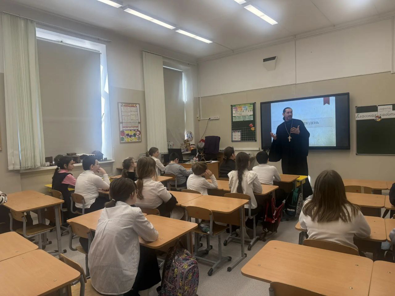 В марте клирик нашего храма иерей Алексей Воскальчук провёл серию уроков в параллели четвёртых классов школы № 1000 (расположенной на улице Щорса) в рамках преподавания модуля по «Основы православной культуры».