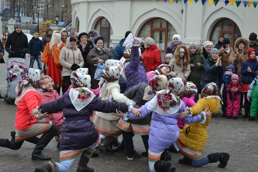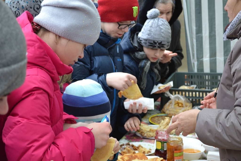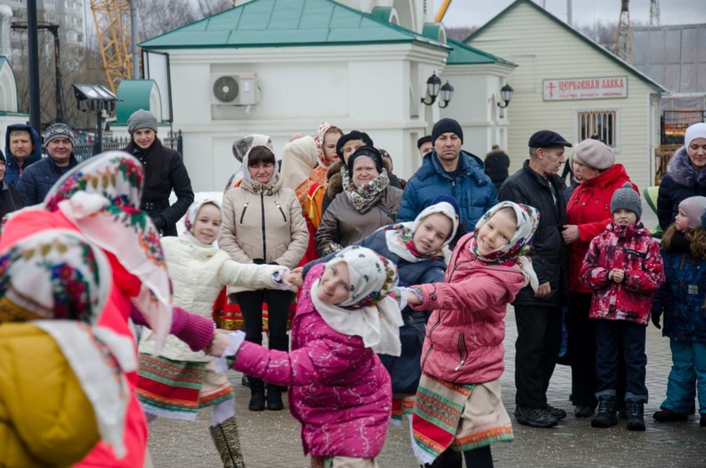По окончании Воскресной службы на площадке перед храмом праздник открыл знаменитый танцевальный коллектив нашего района «Солнцецвет». Так под русские-народные зажигательные мотивы и пустил дым настоящий самовар, приглашая всех ребят на трапезу с блинами.