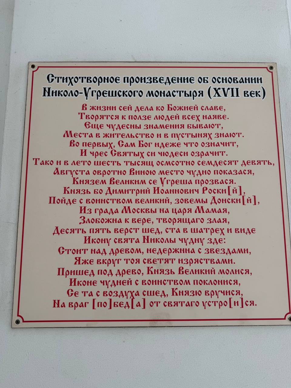 Николо‑Угрешский монастырь — древняя православная обитель с богатой многовековой историей. Она была основана в 1380 году святым благоверным князем Дмитрием Донским, по преданию, после явления ему иконы святителя Николая Чудотворца на этом месте. Это событие укрепило князя перед Куликовской битвой.