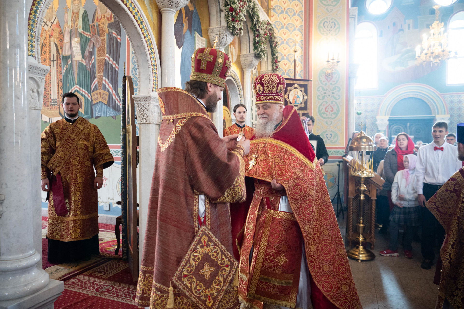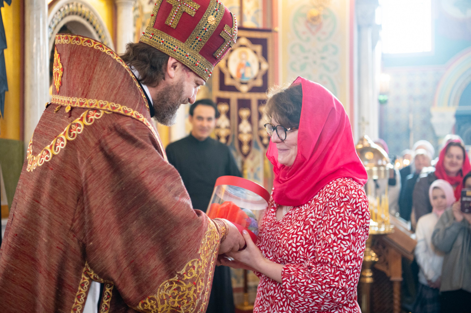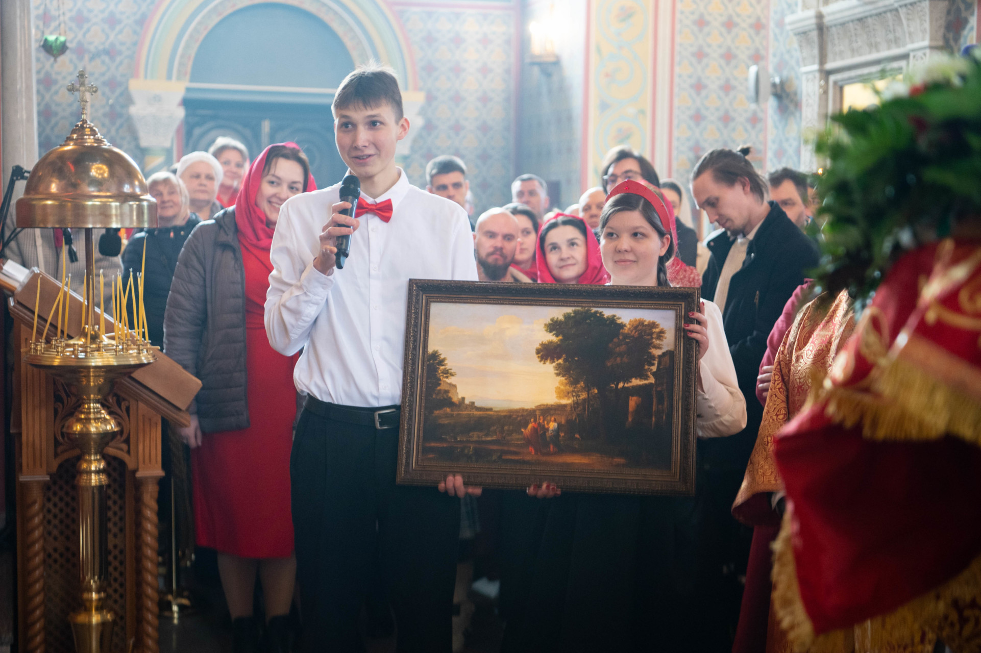 Настоятель храма приветствовал архипастыря и поблагодарил его за совершенное богослужение, затем архиепископа Фому поприветствовали участники приходского молодежного объединения «Маковец» и преподнесли в подарок репродукцию картины «Христос на пути в Эммаус» Клода Желле.