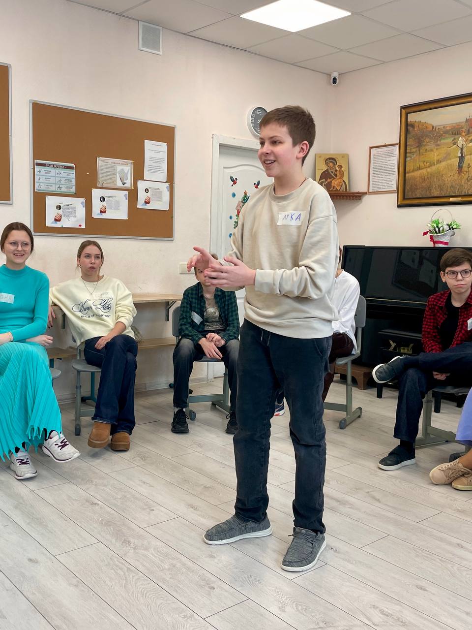 На первом занятии собралось 25 ребят. Вначале все знакомились друг с другом и с ведущими — диаконом Михаилом Жиляком и его супругой Натальей. Программу подготовили Тарас и Юлия Лагутинские — организаторы подросткового клуба «Пилигримия» Патриаршего центра духовного развития детей и молодёжи при Московском Даниловом монастыре. Тарас и Юлия также выступают в роли соведущих в наших подростковых встречах.